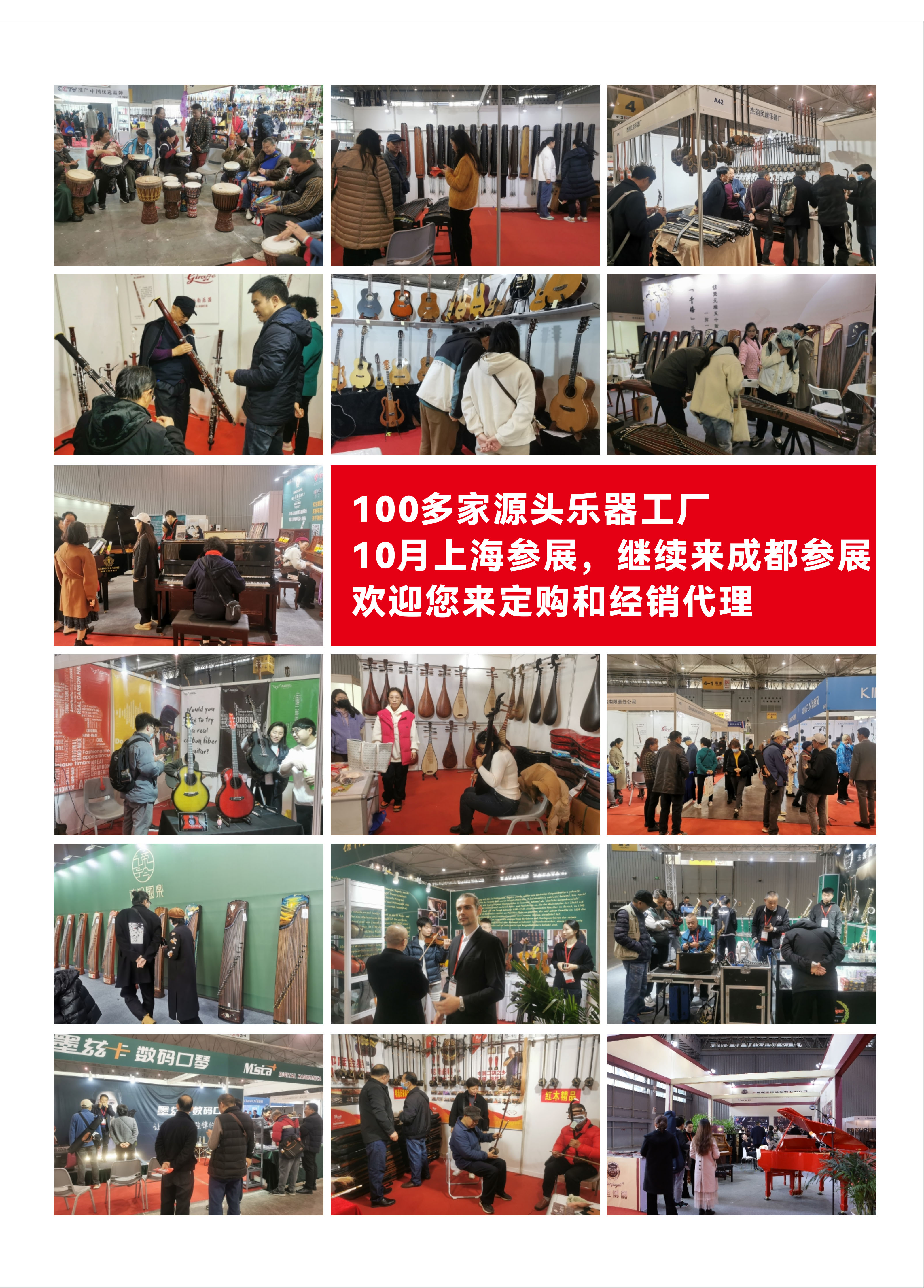 钢琴、提琴、吉他、萨克斯、架子鼓、手风琴、电吹管、空灵鼓、非洲鼓、古筝、古琴、二胡、琵琶、葫芦丝、唢呐、笛箫等常见乐器品种齐全,厂家直销,高品质真实惠,一年一次,不容错过。